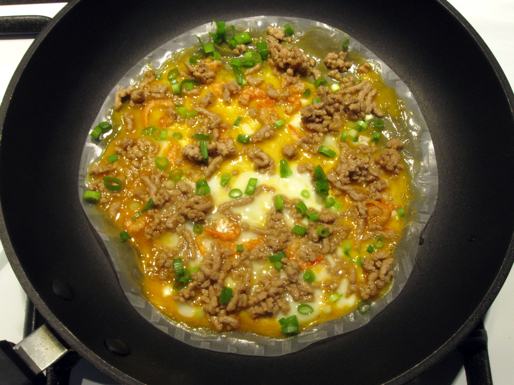 - Place Egg on the Rice Paper and spread it all over it. This makes Rice Paper soft. Scatter the additional ingredients. Today I added Cooked Pork Mince, Dried Shrimps, Spring Onion and Fried Shallots.