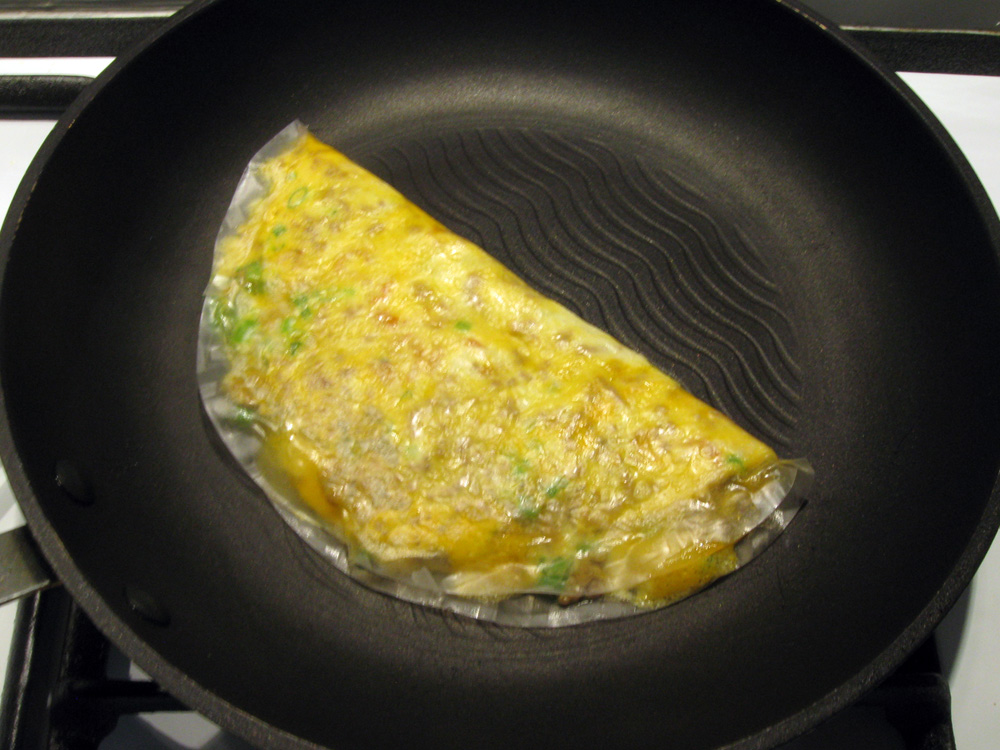 - When Egg is cooked, Rice Paper should be soft by then, fold in half and keep cooking until Rice Paper is crispy.