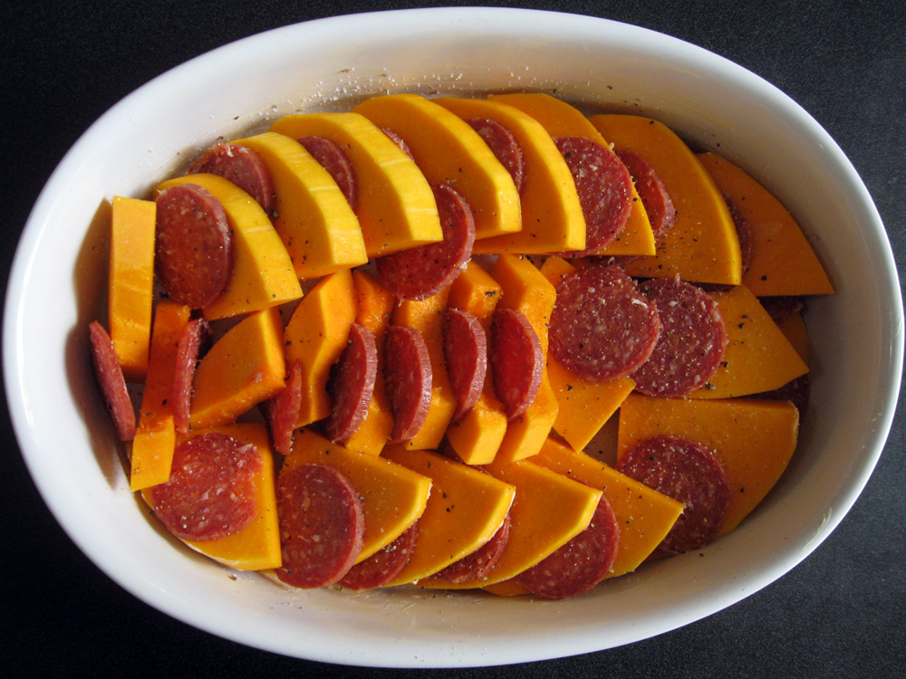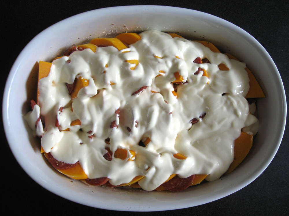 - Evenly arrange Pumpkin and Salami in the prepared baking dish. Sprinkle with Salt and Pepper and drizzle Sour Cream mixture over.