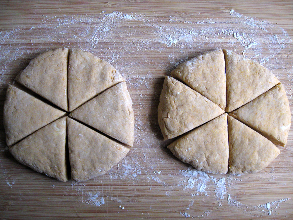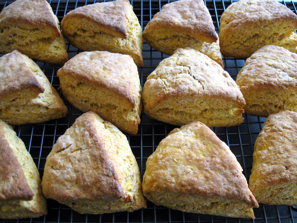 All my Scone recipes are based on Auntie Lorna’s Scone recipe. I needed to alter the amount of Milk for these scones because I added 1/2 cup pureed Pumpkin. It is a coincidence that these Pumpkin Scones have a strong resemblance to the famous coffee shops’ scones. I have never been to those coffee shops and I don’t know if my scones taste like their scones.