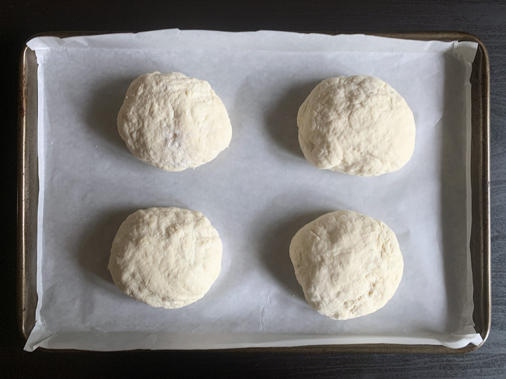 - On a lightly floured surface, shape into a ball, divide into 4 portions, and roll each portion into a ball. *Note: You can divide into 6 to 8 portions and make smaller rolls.