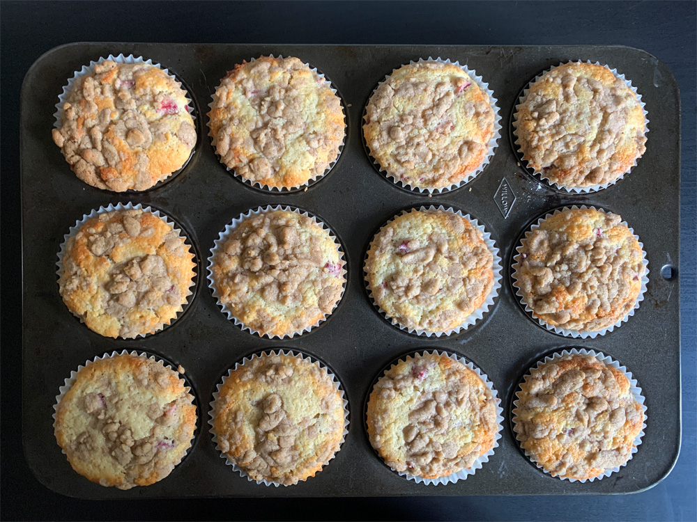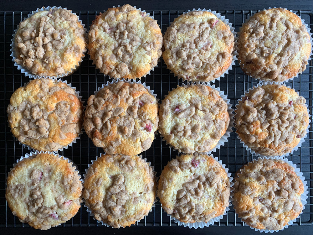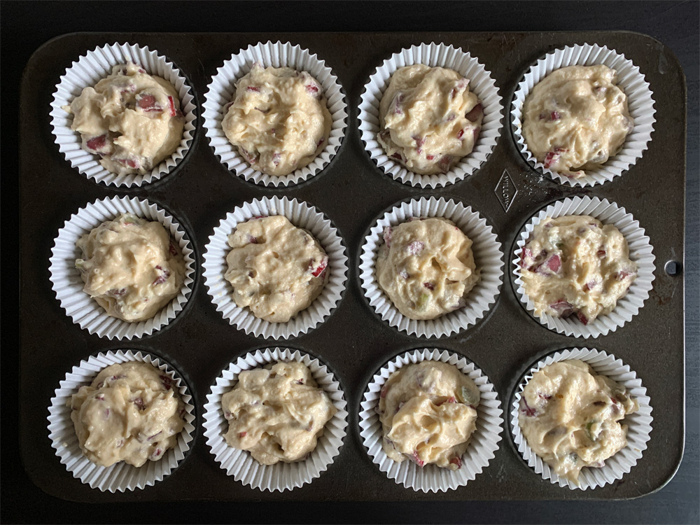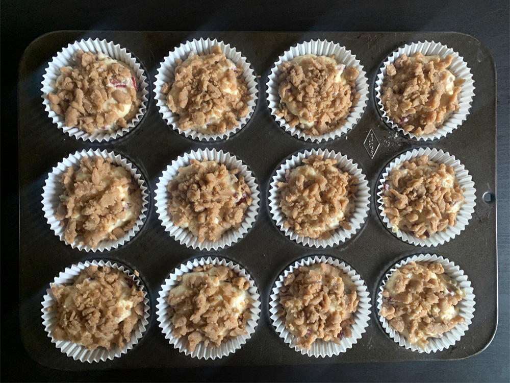 - Add the sliced Rhubarb, combine evenly, and spoon the mixture into paper cases. Place some Cinnamon Crumble on top.