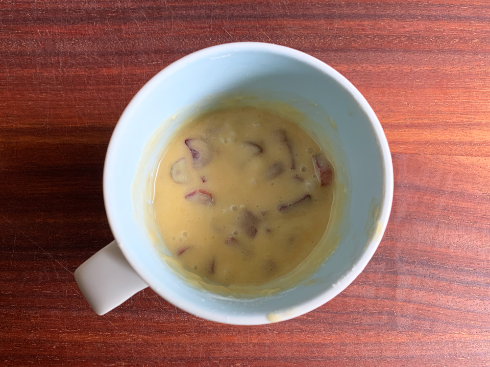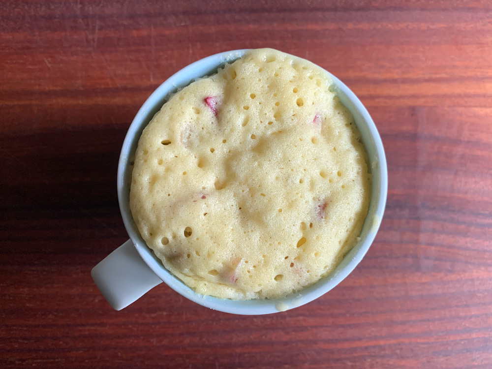 - Add sliced Rhubarb, mix to combine, and microwave for 1 to 1 & 1/2 minutes OR until cooked. *Note: Try not to over-cook it as the cake turns very dry. I used 1000W microwave and 1 & 1/2 minutes was a little too long.