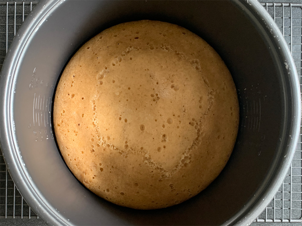 7. *Note: Top side of the cake cannot be browned, but the cake looks fine upside-down. It took 40 minutes for my rice cooker to cook.