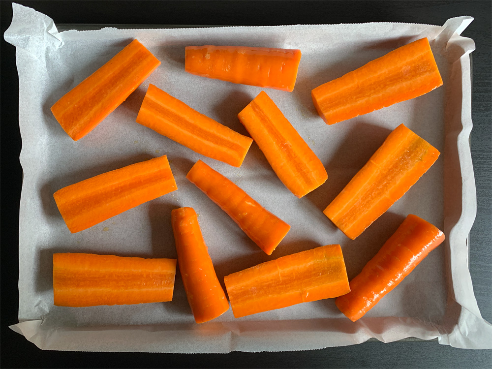 - Wash Carrots, dry with tea towel, and cut them as you like. Today I cut them in half and cut thick parts in half lengthways as well. Place in a mixing bowl, coat with Oil, arrange them on the prepared tray, add add a pinch of Salt. Roast for 20 minutes OR until half cooked.