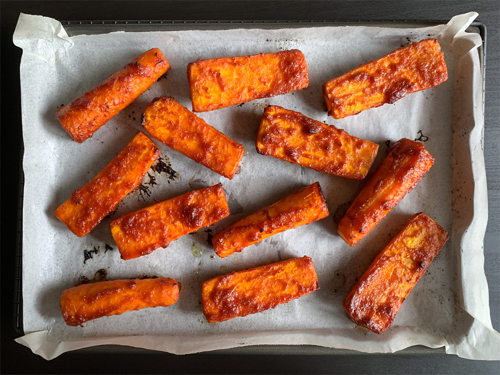 Today I wanted to cook Asian flavoured Roasted Carrots. I was going to use my ‘Char Siu’ sauce, but the sauce is very sweet and I was afraid it would be too sweet for Carrots. Then I decided to use Gochujang Sauce that I often use for Chicken and Tofu dishes, e.g. ‘Gochujang Tofu Rice Bowl’. When the Carrots were roasting, my kitchen smelled amazing, and the Roasted Carrots tasted great.