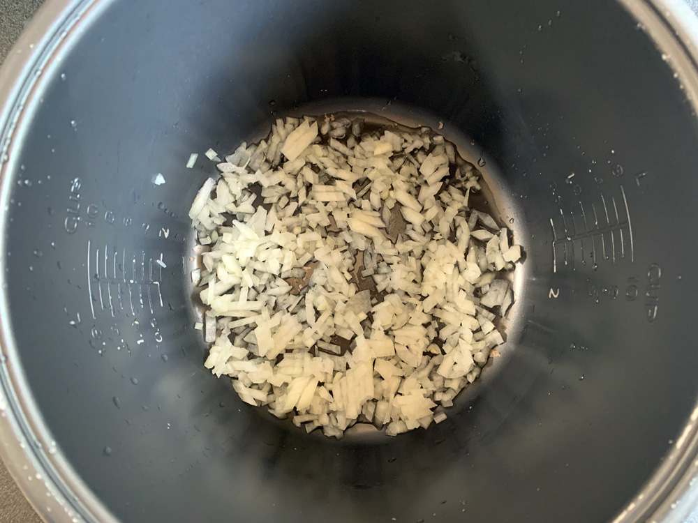 - Spread Oil in the rice cooker’s inner pot and scatter finely chopped Onion.