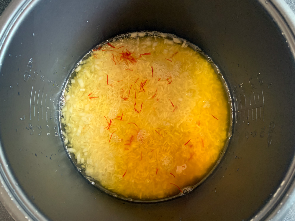- Add the Saffron Threads and yellow water, then add cold Water OR Stock up to the 2-cups-marking. *Note: If you use Stock Cube, break in into crumbs OR shave it.