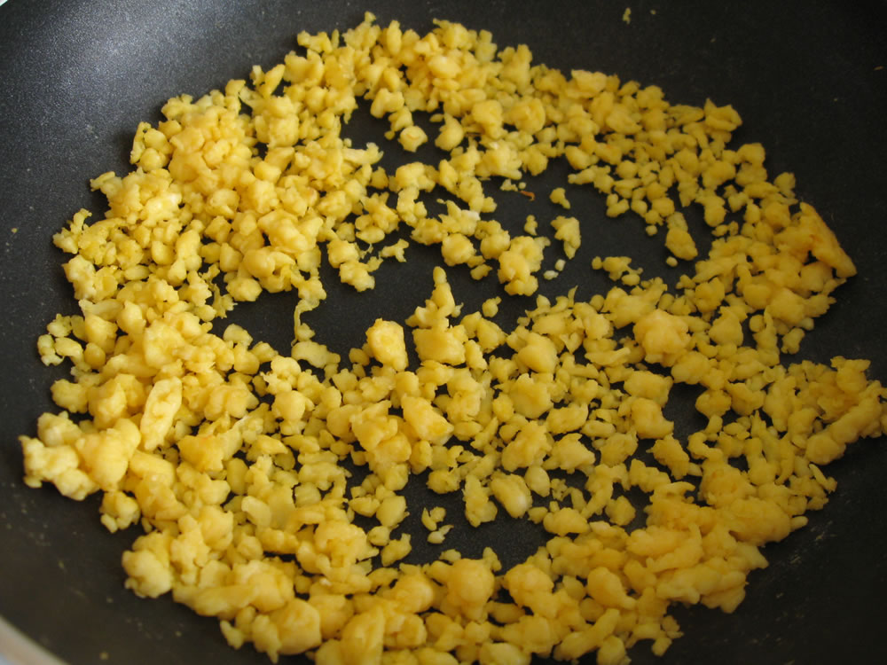 - Cook Egg(s) seasoned with Salt in the same way as salmon, over a low heat, stirring constantly, until the Egg crumbs are dry. Cool completely.