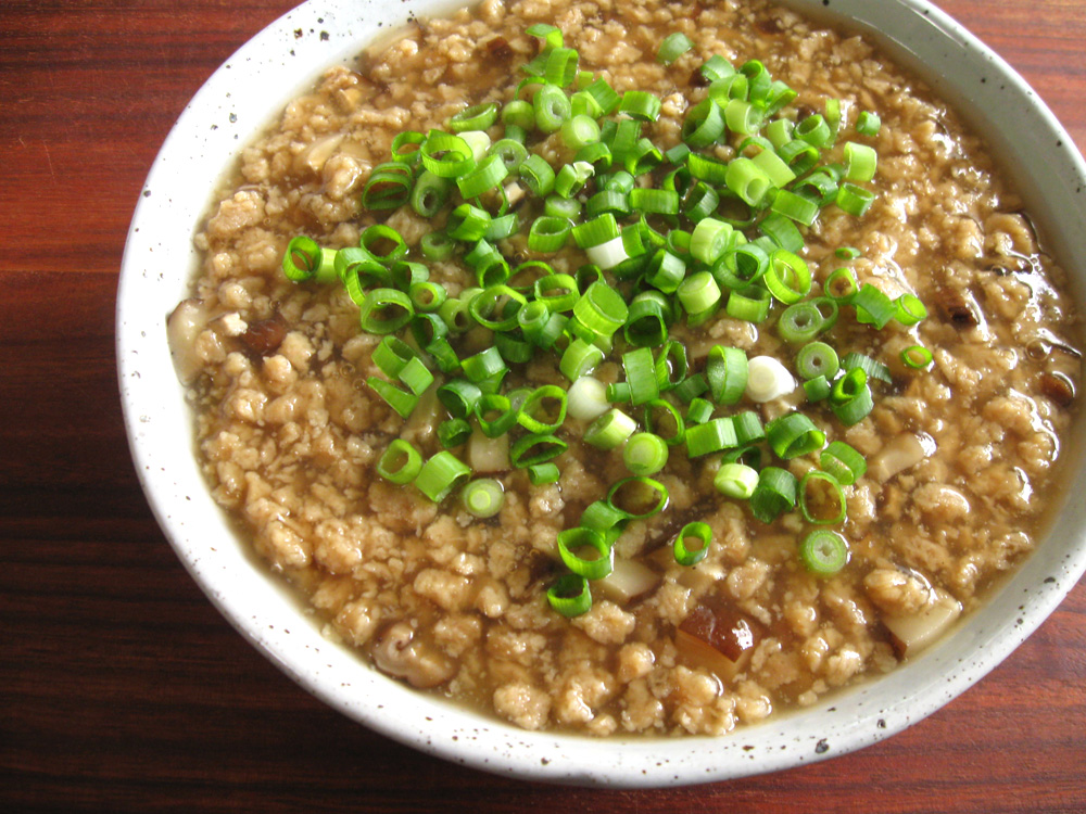 - To make sauce, heat Sesame Oil in a saucepan, add Soy Meat (OR other Meat) and Shiitake, and stir for a few minutes. Add Stock and Ginger, season with Salt, Soy Sauce and Mirin. Simmer for a few minutes. Mix Potato Starch and Water in a small bowl and gradually add, stirring, to thicken the sauce. You don’t need to use all the potato starch mixture.