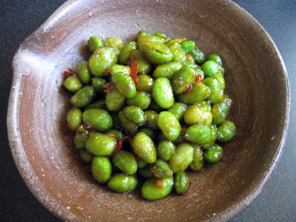 Here is another great dish for drinking. Of course it is great with freshly cooked rice, too. You can use Canned Soy Beans, but I like crunchy Edamame Beans better. The coating of Potato Starch is the key to the scrumptiousness. Do not omit it.