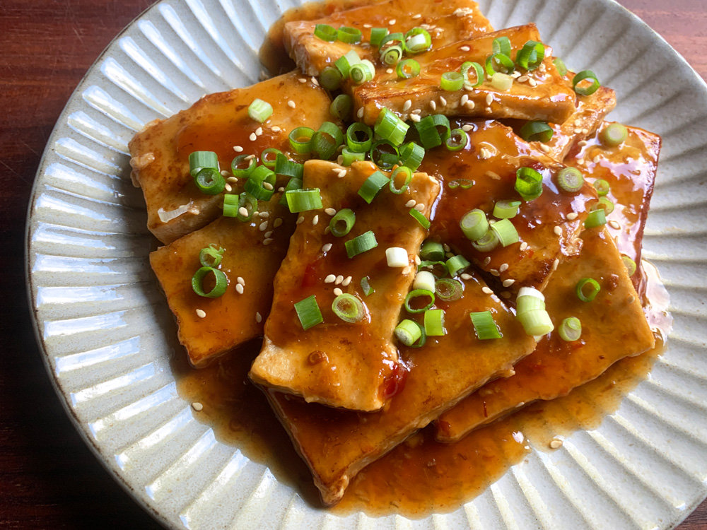 - Heat Oil in a frying pan over medium heat, cook Kōya Dōfu until both sides are nicely browned. Mix the Sauce well, pour it over, and cook, turning over the Kōya Dōfu pieces, until the Sauce is thickened. Sprinkle with finely chopped Spring Onion and some Toasted Sesame seeds. It’s a good idea to make this dish into rice bowl.