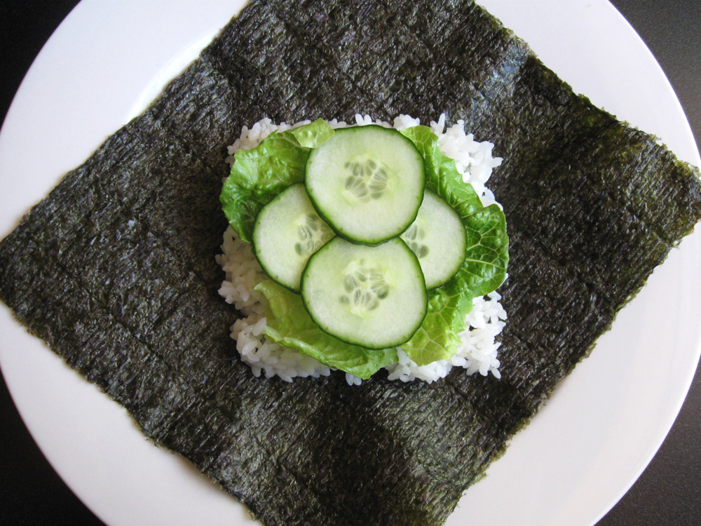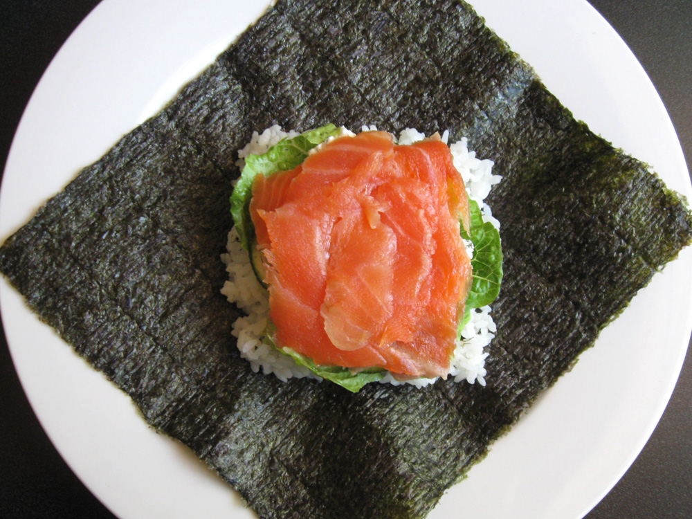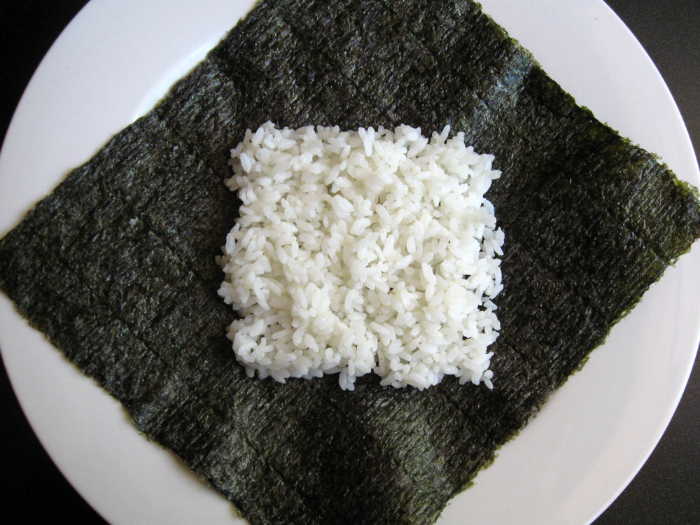 - Place thin layer of Sushi Rice in the centre of a Nori sheet, shape it into a square so that it would be easy to wrap.