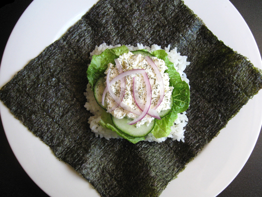 - Place some Salad Vegetables, then creamy Cottage Cheese or Cream Cheese, and add some Dill and Onion. Top with Smoked Salmon.