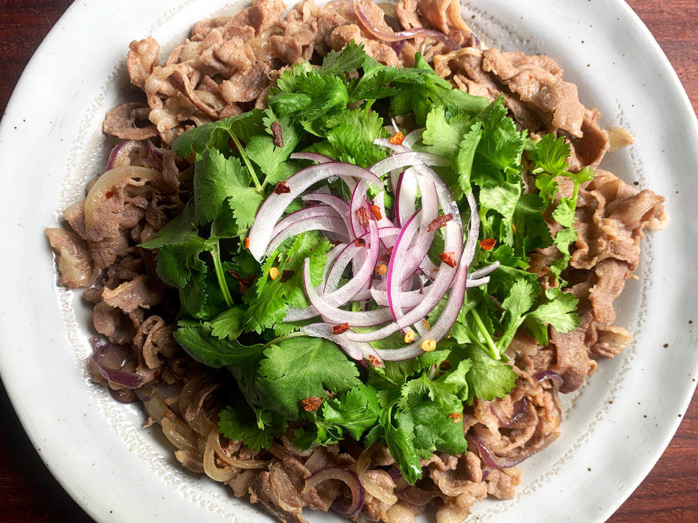 - Transfer to a serving plate, add plenty of Coriander Leaves and the saved thinly sliced Onion, and enjoy. It is great with chilled Beer, OR enjoy with freshly cooked Rice.