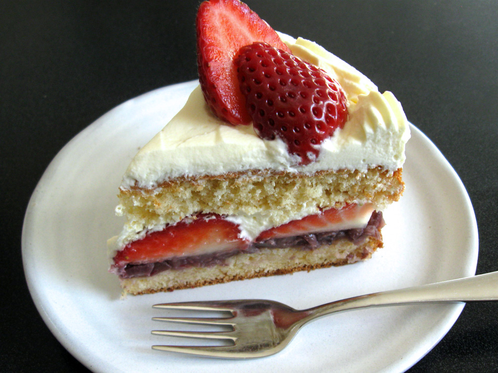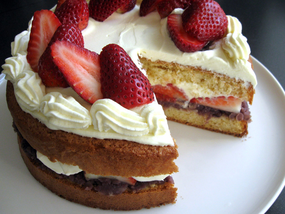 - Slice the cake in half, spread ‘Tsubu-an’ (Sweet Azuki Paste), arrange Strawberries, cover with some whipped Cream, and decorate with remaining whipped cream and Strawberries.