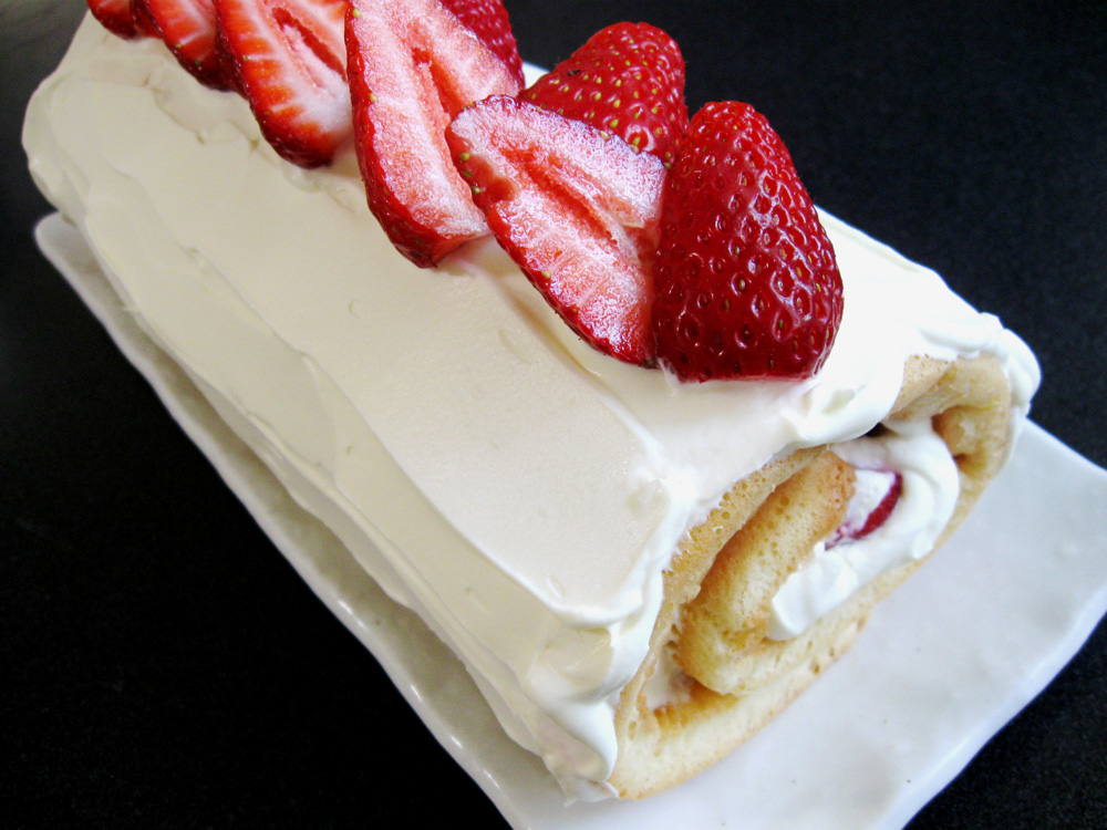 - Place the sponge onto a clean work surface and peel the baking paper, but do not remove the paper. Spread the whipped Cream over the sponge, whichever side you prefer, scatter the Strawberry pieces evenly, then roll sponge to enclose filling using the paper.