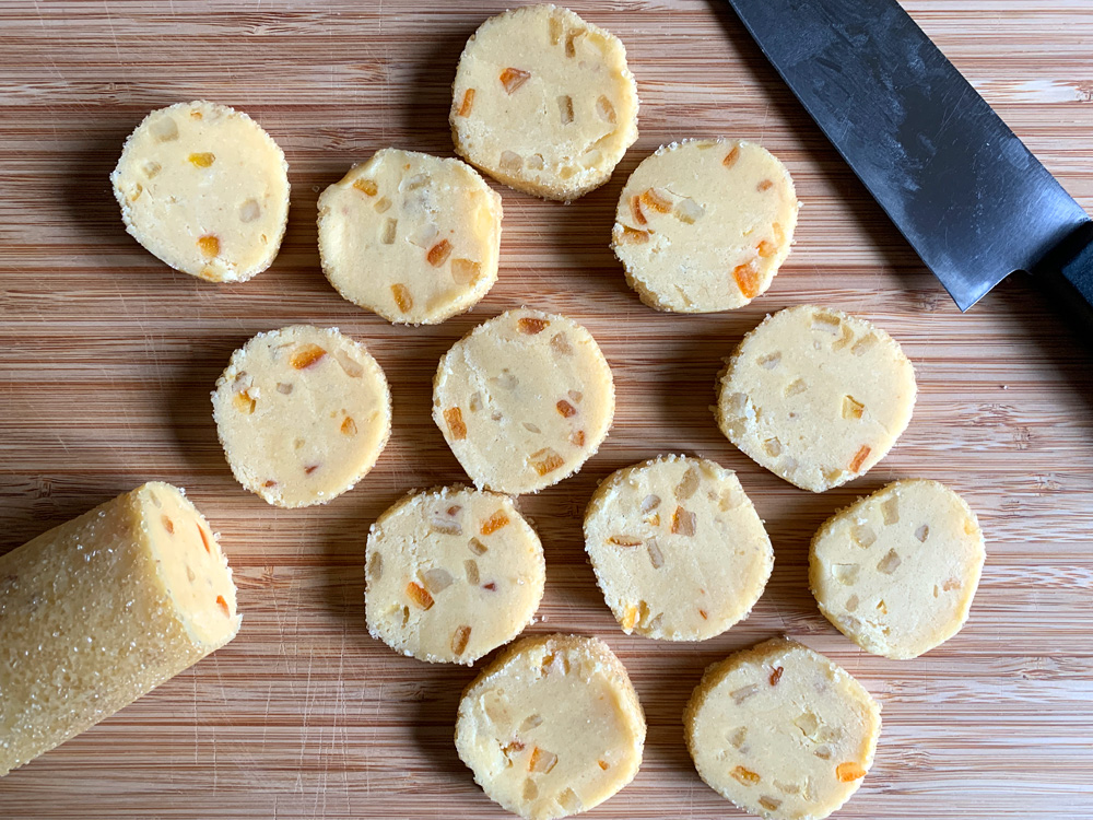 - When it is firm, remove and discard the plastic wrap, coat the log(s) with coarse Sugar granules, and slice into 1cm thick rounds. Today I made 22 cookies.