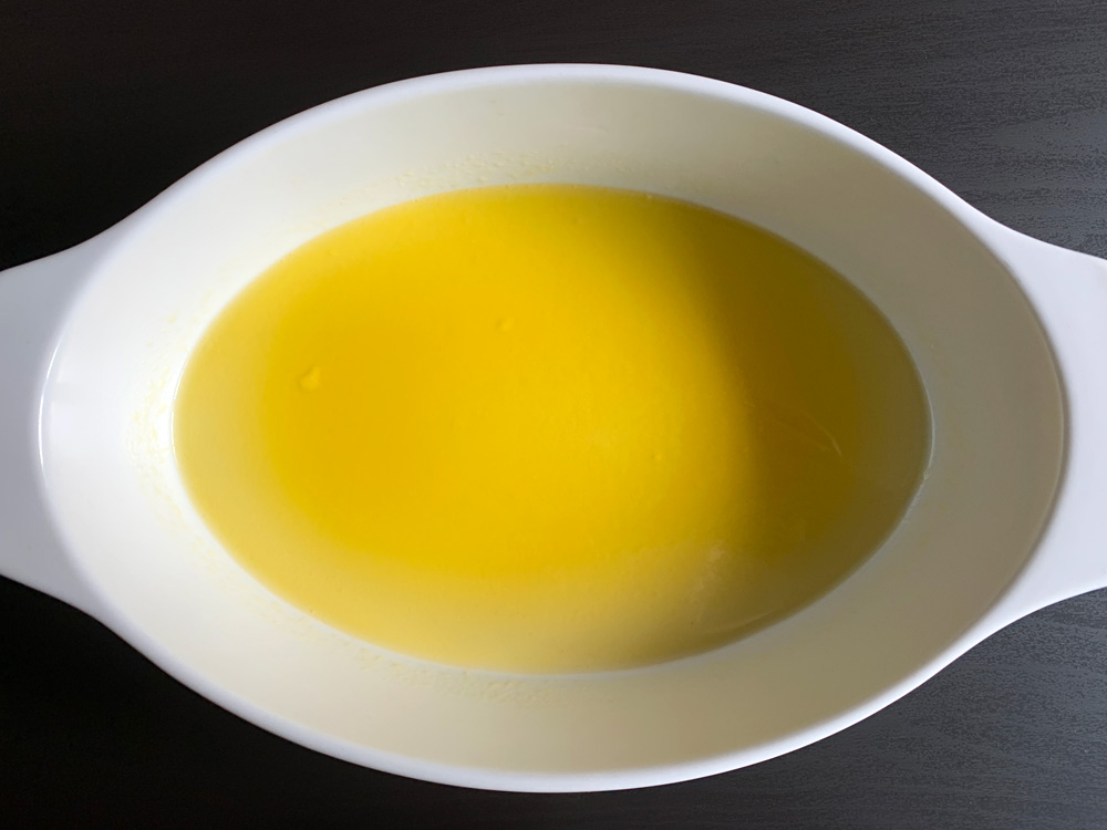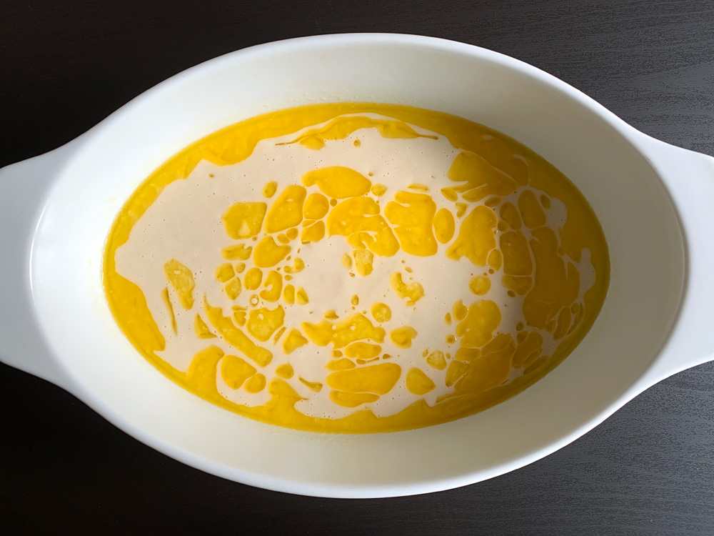 - Place chopped Butter in the baking dish and microwave to melt, OR spread melted Butter in the dish. Combine all other Batter ingredients in a measuring jug OR bowl, and pour it over the melted Butter evenly.