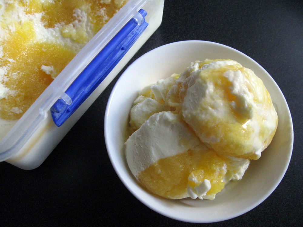 - Pour 1/2 of Cream & Yoghurt mixture into a container, shallower container is better, drizzle Mango puree over, cover with remaining Cream & Yoghurt mixture, and freeze for a few hours until firm.