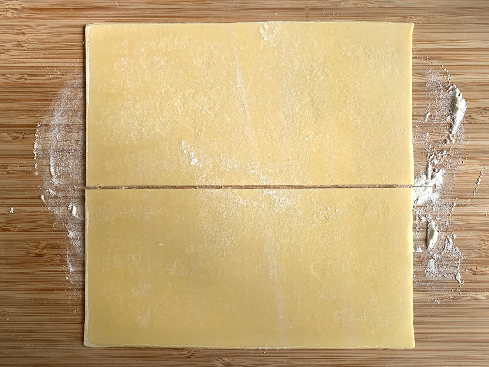 - Dust a flat work surface such as a cutting board with Flour, place a sheet of Butter Puff Pastry, and cut in half.