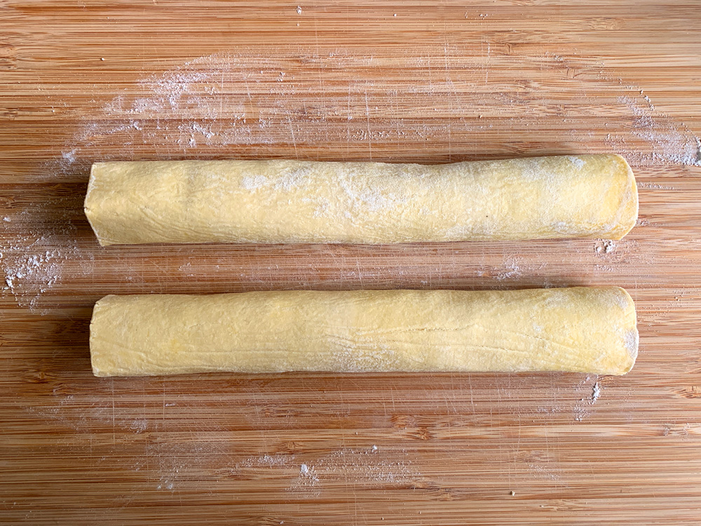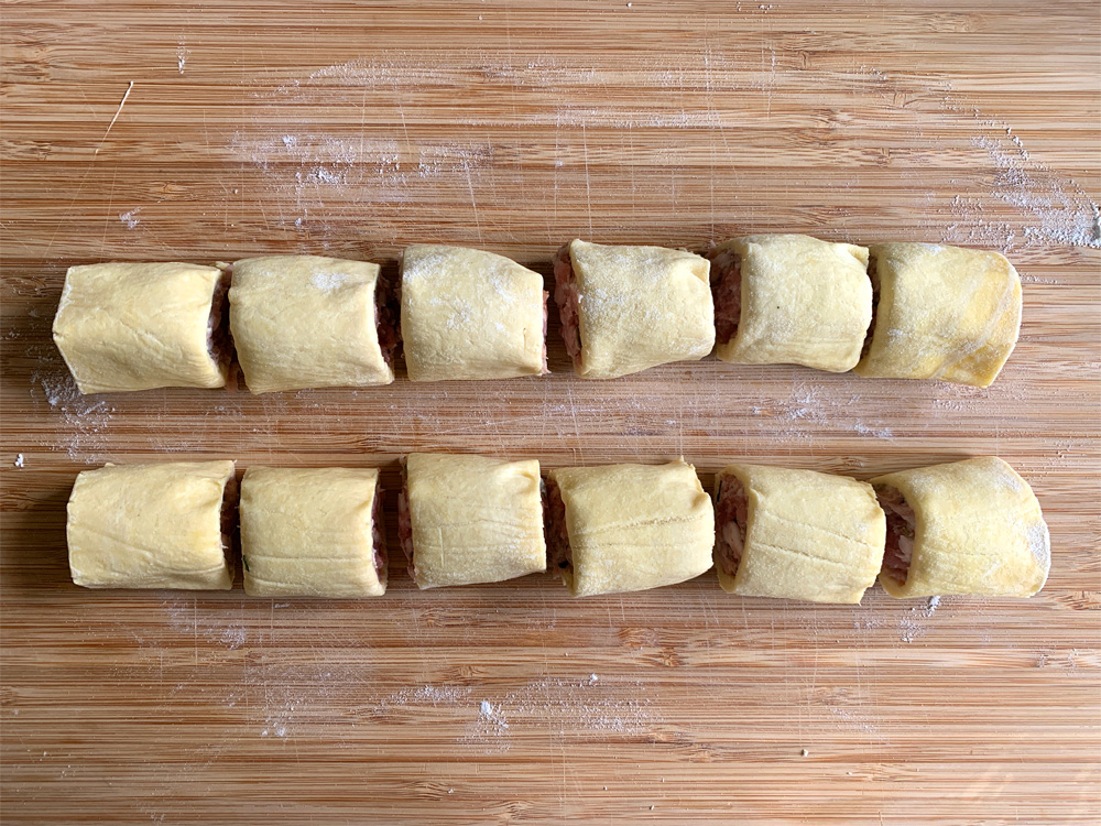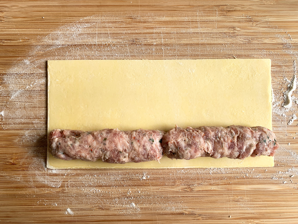 - Remove casing from the Sausages. Place two Sausages along the long edge, roll up, then set aside, sealed side down. Repeat with the other half sheet of Puff Pastry and remaining Sausages.