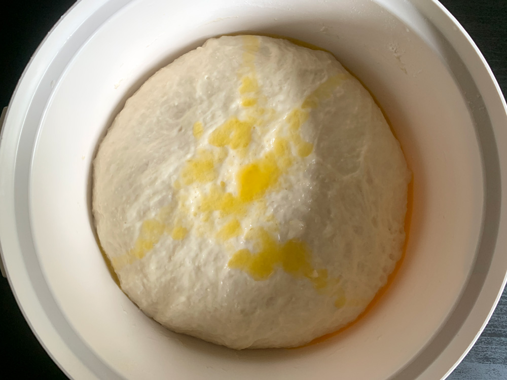 - Place Bread Flour, Dry Yeast, Sugar and Salt in a large bowl, and blend well. Add Warm Water and stir using a spatula. Add Oil, and stir very well. The dough is soft and gooey. Cover and set aside in a warm place for 10 minutes.