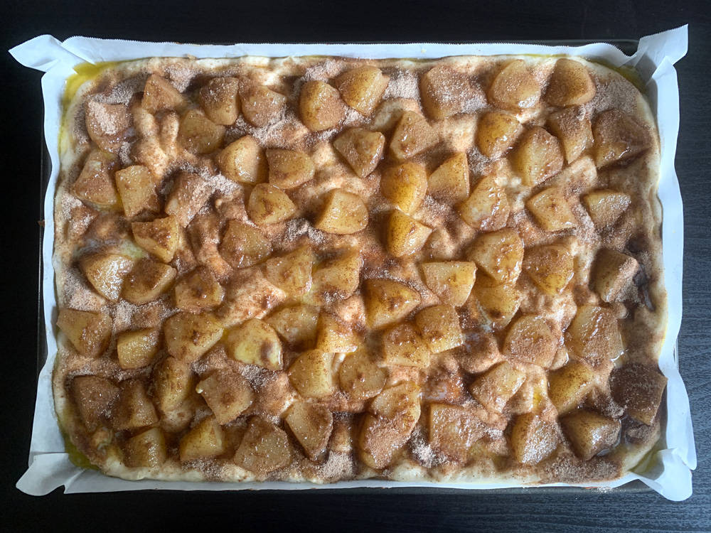 - Preheat oven to 180°C. Mix Apple pieces and Cinnamon Sugar, spread them over the dough, and arrange the Apple pieces evenly, slightly pressing them down. Wait until oven is hot. By then, the dough will rise more.