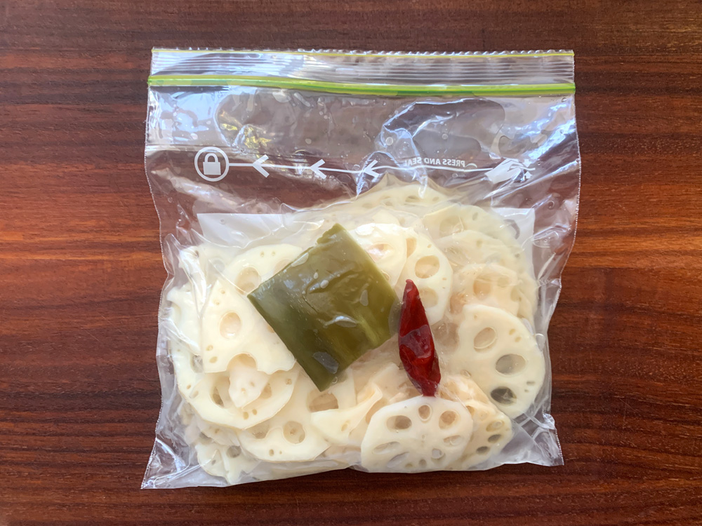 - When cooled enough, I recommend to transfer to a ziplock bag, so that Lotus Root slices can get marinated with this minimal amount of Marinade evenly. Leave it in the fridge overnight.