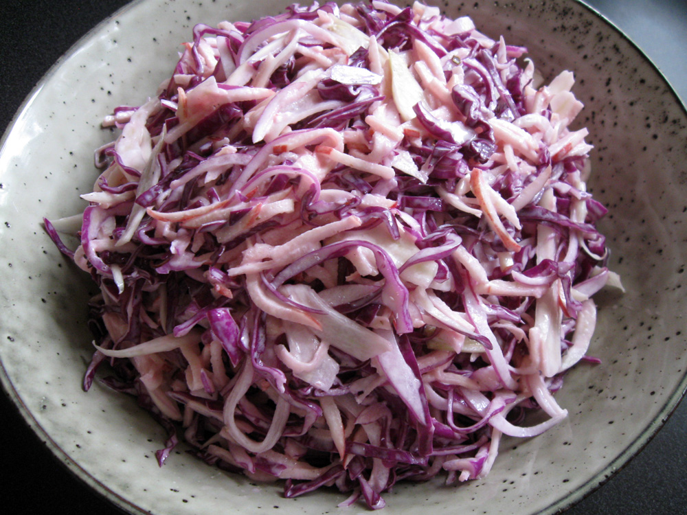 My ‘Fennel & Apple Coleslaw’ is so refreshing and it can go well with BBQ, Fried Chicken, Sausages, etc. Today I made it with Red Cabbage and I added Red Onion. The result was brilliant. This extra crunchy coleslaw with a striking colour and a tangy flavour will be a winner! Makes 4 Servings Ingredients …
