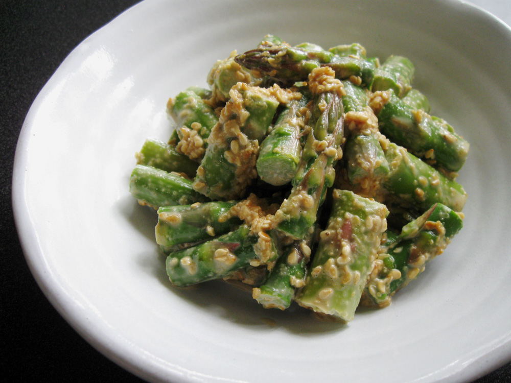 ‘Goma-ae’ is a Japanese dish of vegetables dressed with ‘Goma-ae’ sauce, which is made of Toasted Sesame Seeds, Sugar and Soy Sauce. Today I added Japanese Mayonnaise to it and I reduced the amount of Sugar. Creamy ‘Goma-ae’ sauce and Asparagus are a good match. Makes 2 Servings Ingredients 1 bunch (150g) AsparagusSalt for cooking …
