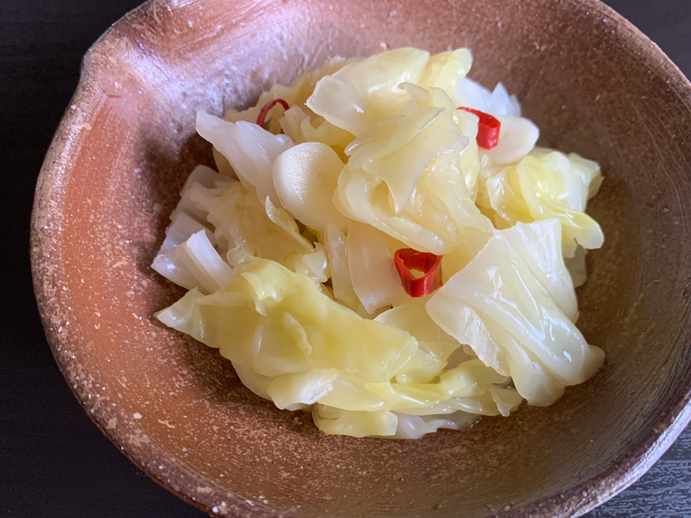 This dish is basically pickled Cabbage, and I use my Sushi Vinegar as marinade. My family’s Sushi Vinegar that I learned from my mother is fairly sweet. It can be used to marinate many vegetables. I added Garlic and Chilli. You can eat it straight away but I recommend to wait for a day. Just …