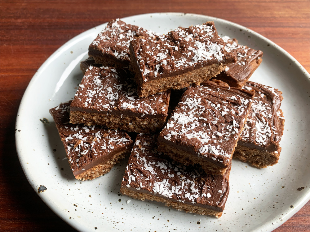 In Australia where I live, ‘Chocolate Slice’ means this type, ‘Chocolate & Coconut Slice’. It’s very popular and quite easy to make. Many people have their own recipes, and this is mine. You don’t need to weigh ingredients. Just mix ingredients and bake, and impress your friends and colleagues. Cake Tin 34cm x 20cm Brownie …