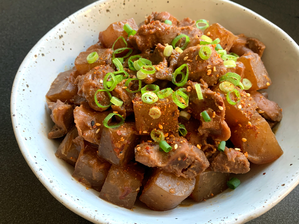 This is my easy version of ‘Oden’, a popular Japanese one-pot dish. My favourite ingredients in ‘Oden’ are Daikon, Konnyaku (Konjac) and Fish Balls. So, I just cook those three ingredients for this easy version. I recommend to cook this dish ahead of dinner time, and reheat before serving. Daikon and Konnyaku would taste much …