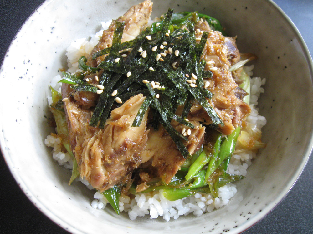 Canned Mackerel costs slightly more than Canned Tuna, but both are really handy items to stock in the pantry. My husband says Canned Mackerel smells bad, but I love it. Canned Mackerel makes delicious Rice Bowl dishes. ‘Curry Mackerel Don’ and ‘Miso Mackerel Don’ are just a few example. Here is another Rice Bowl dish …