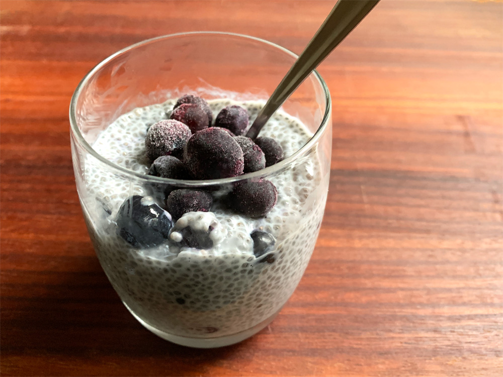 This is my favourite way to enjoy Chia Seeds. To achieve the consistency of the pudding that I like, I mix 2 & 1/2 tablespoons Chia Seeds with 1/2 cup Milk and 1 teaspoon Maple Syrup. And I always add some Frozen Blueberries, because I always have them. You may wish to add fresh Blueberries …