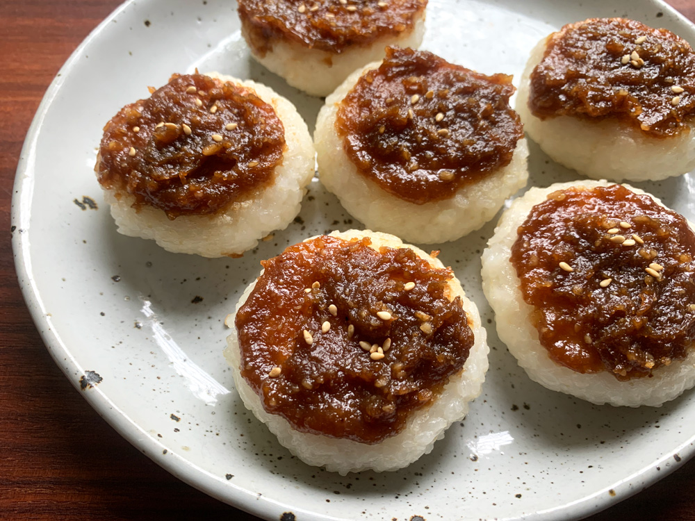 In Japan’s Chūbu region, there is a famous food called ‘Gohei Mochi’ (五平餅). The typical ‘Gohei Mochi’ is made with Non-glutinous Rice, pounded, attached on thick skewers, and coated with sweet Miso Sauce. They are supposed to be grilled at the fireside. This traditional cooking method is impossible these days. Many people don’t have griller …