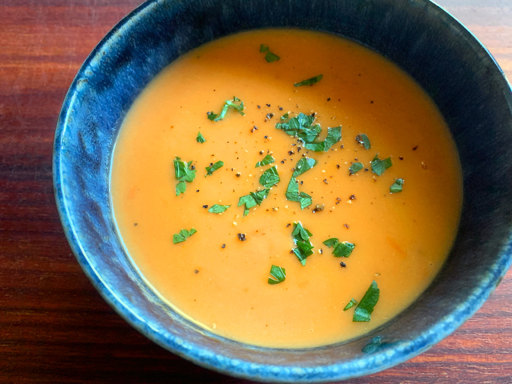 I had some left over Semi Dried Tomatoes. Today I used them to make this Creamy Soup that I have been craving for a few days. It is silky smooth and very creamy, but you don’t need Flour OR any dairy. The soup is creamy because of Potato. Absolutely simple and easy to cook. Enjoy …