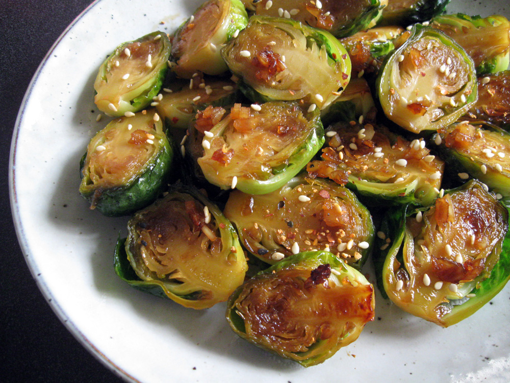 - When the water in the pan is evaporated, remove the lid, pour over the sauce, and keep cooking until the sauce is gone and Brussels Sprouts are nicely browned.