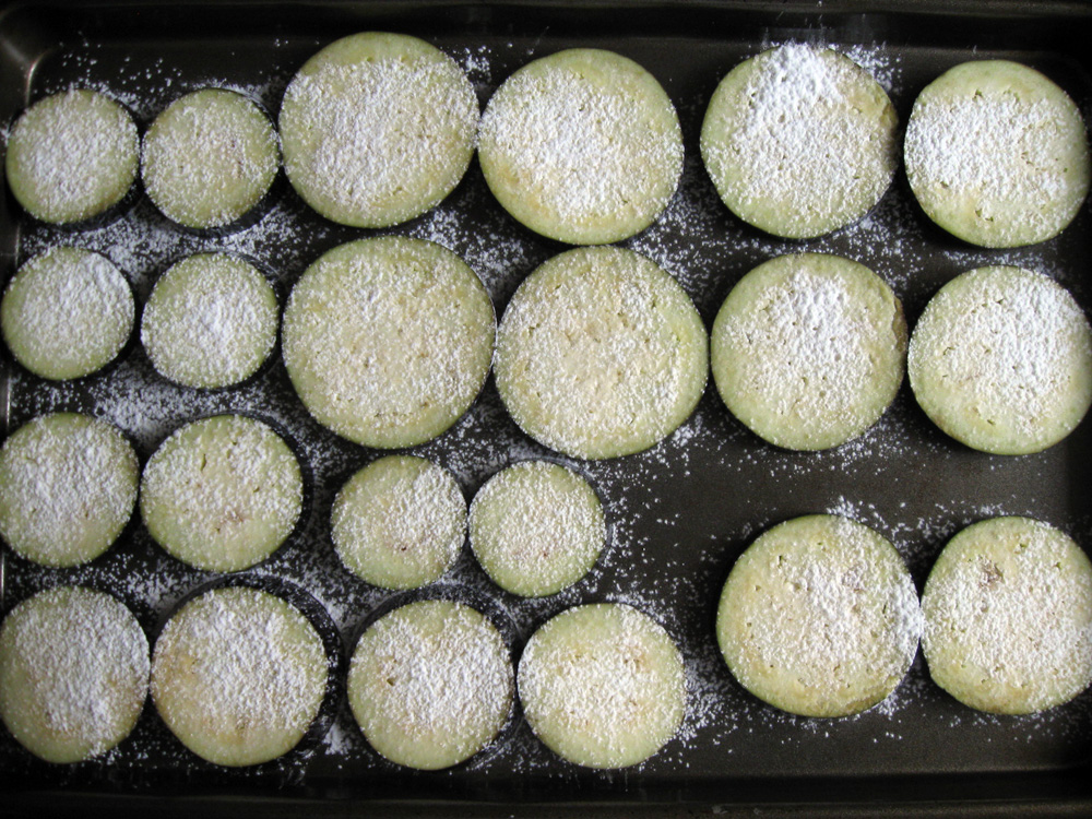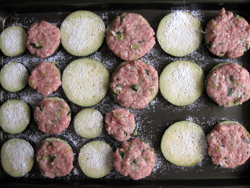 - Cut Eggplants into 8mm thick slices, make pairs with similar size slices, and place on a large tray. Sprinkle with Plain Flour.