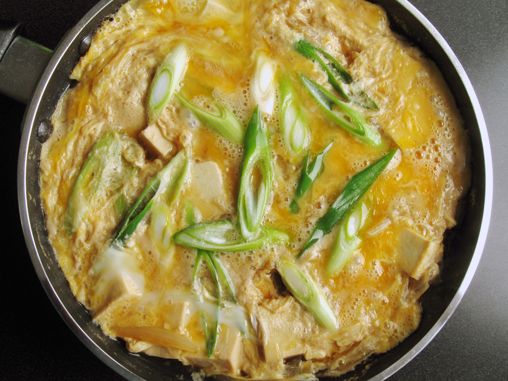 - Place Tofu and Spring Onion, bring back to the boil, pour over lightly whisked Eggs but DO NOT stir. Cover with a lid until the egg is softly cooked.