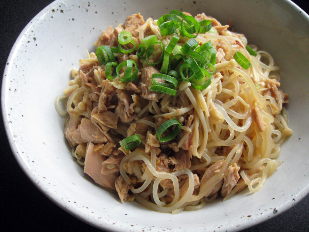 - Heat Oil, Garlic and Chilli in a frying pan over medium heat, add Enoki and drained Tuna, and stir until Enoki is cooked. It won’t take long at all.
