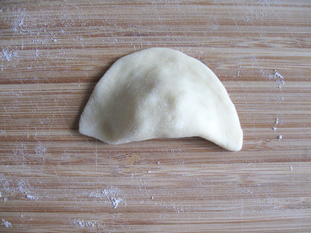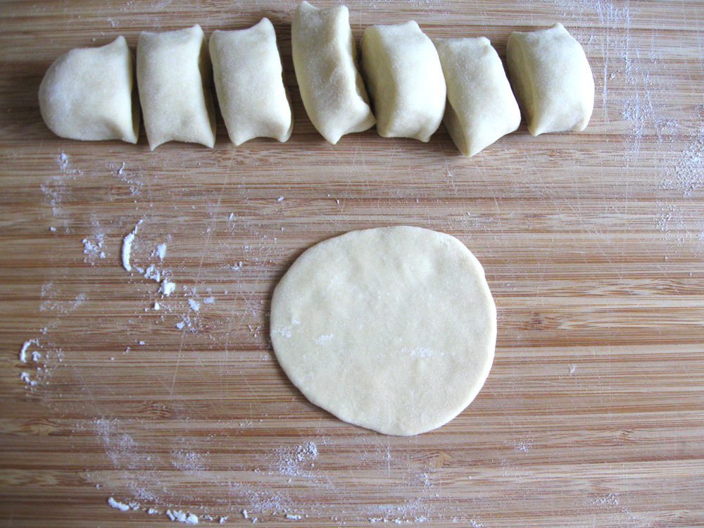 - Divide the dough into 4 portions. Form one portion into a log about 15cm long on a floured surface such as a chopping board, and cut into 8 or 10 pieces. Today I cut into 8 pieces as it is easiest.