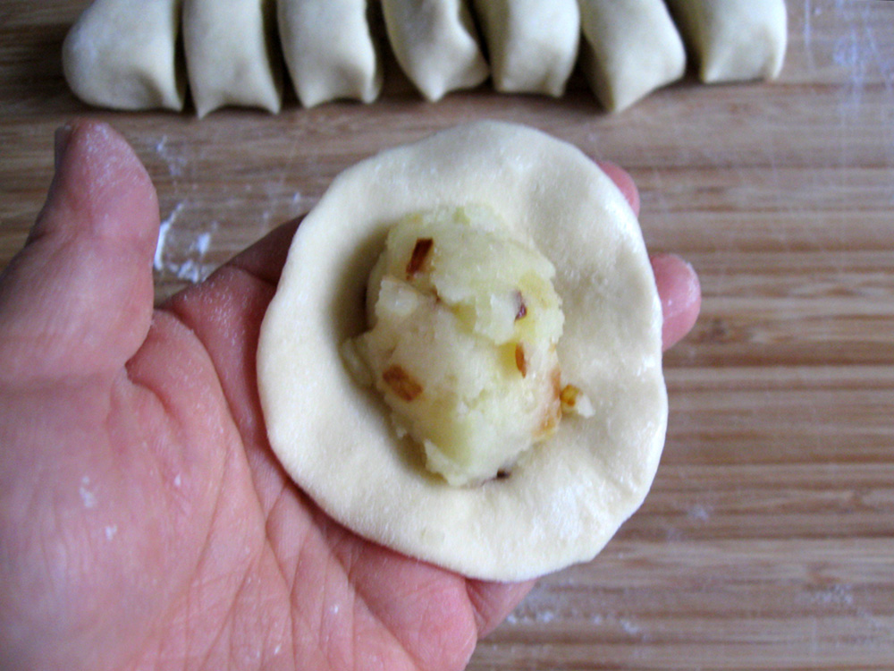 - Press down each piece using your hand OR roll out using a rolling pin into 2mm thin round. Place a heaped teaspoonful Potato filling in centre, you can place as much as you can wrap, wet the edges with water, and close the edges.