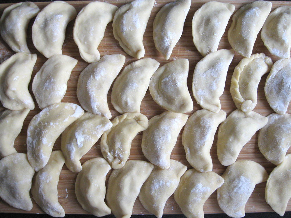 - Cook ‘Varenyky’ in rapidly boiling salted water. When ‘Varenyky’ are floating, cook a few more minutes, and transfer to a bowl using a slotted spoon or small skimmer. Add a small amount of the saved Oil and toss to coat. Continue cooking the remaining ‘Varenyky’.