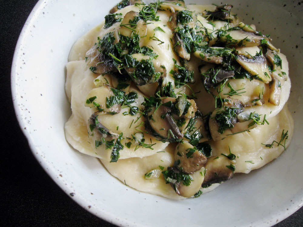 - The photo below is the same ‘Varenyky’ served with the sauce of Garlic & Mushroom that was cooked in a generous amount of Olive Oil, seasoned with Salt, then added Parsley and Dill.