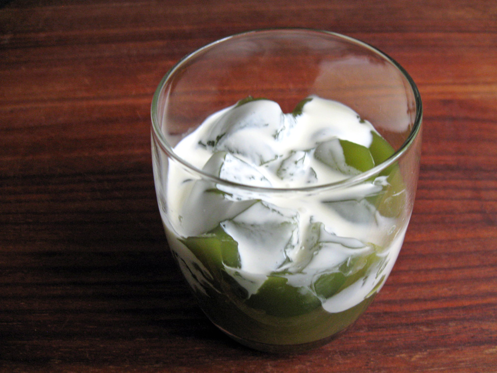 - When cool enough, place the glasses (OR container) in the fridge and leave to set completely. Enjoy with Cream, Vanilla Ice Cream, Milk, Sweet Azuki Paste, etc. *Note: I broke up the jelly and poured Cream for the photo below.