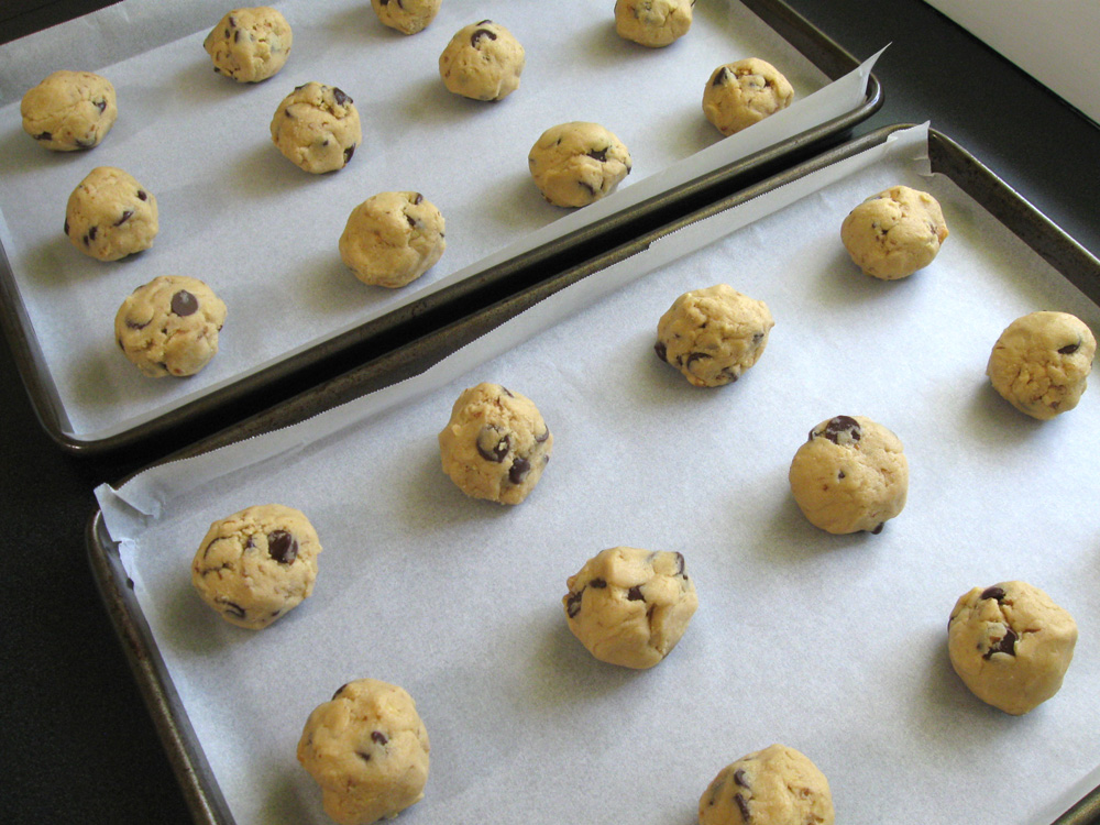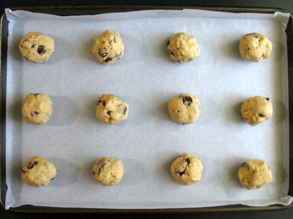 4. Roll the dough into 24 balls, about 3cm size, and place on the prepared trays, 12 balls each. You may wish to press down slightly.