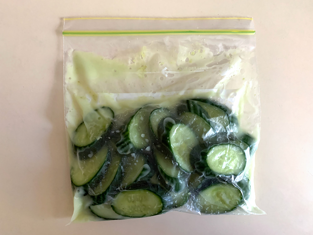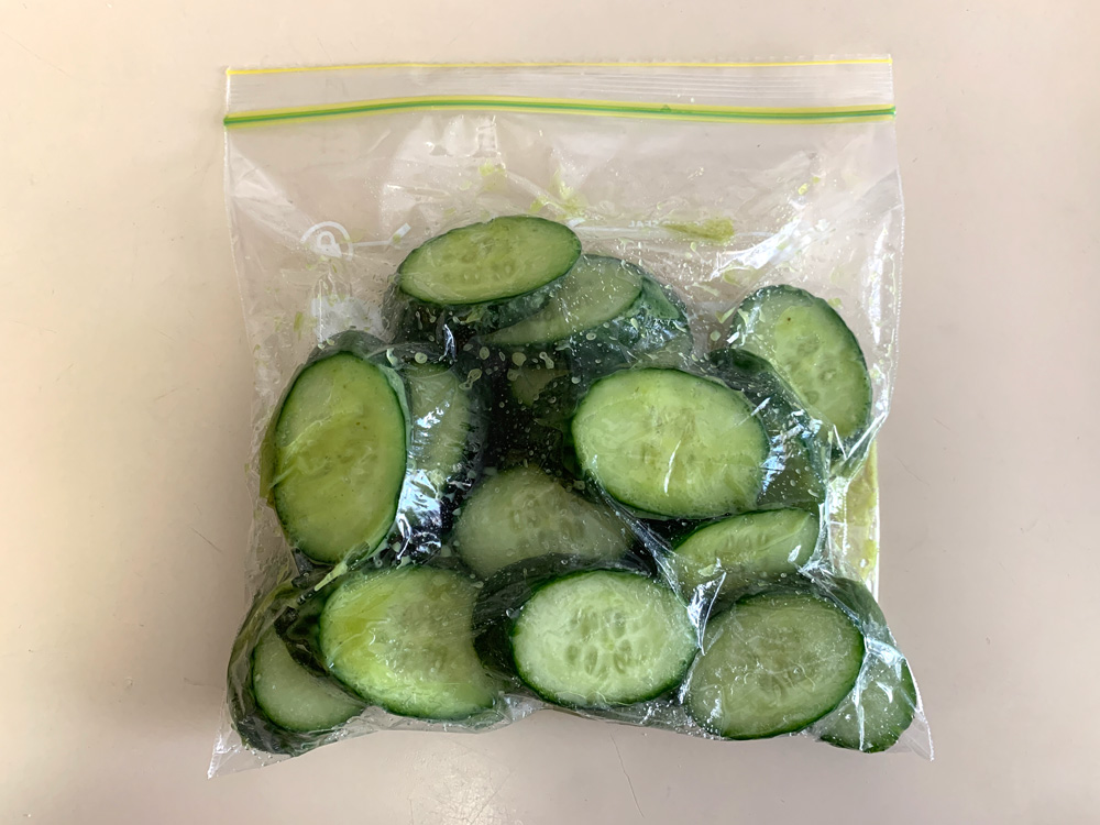 - Place everything in a ziplock bag, rub and combine well, then remove the air. Leave the bag in the fridge for several hours. *Note: Change the position occasionally, so that the Cucumber pieces will get pickled evenly.